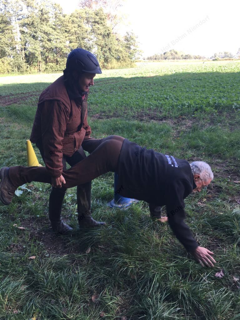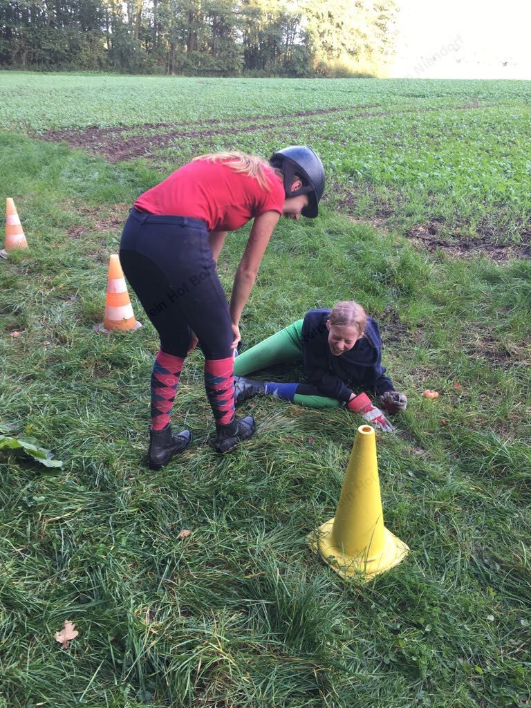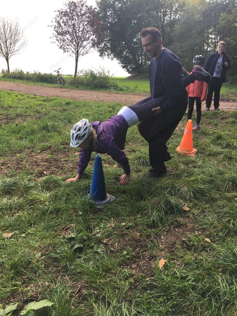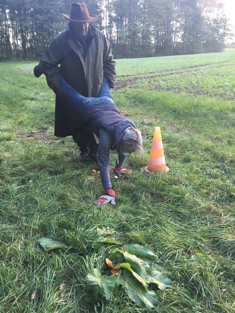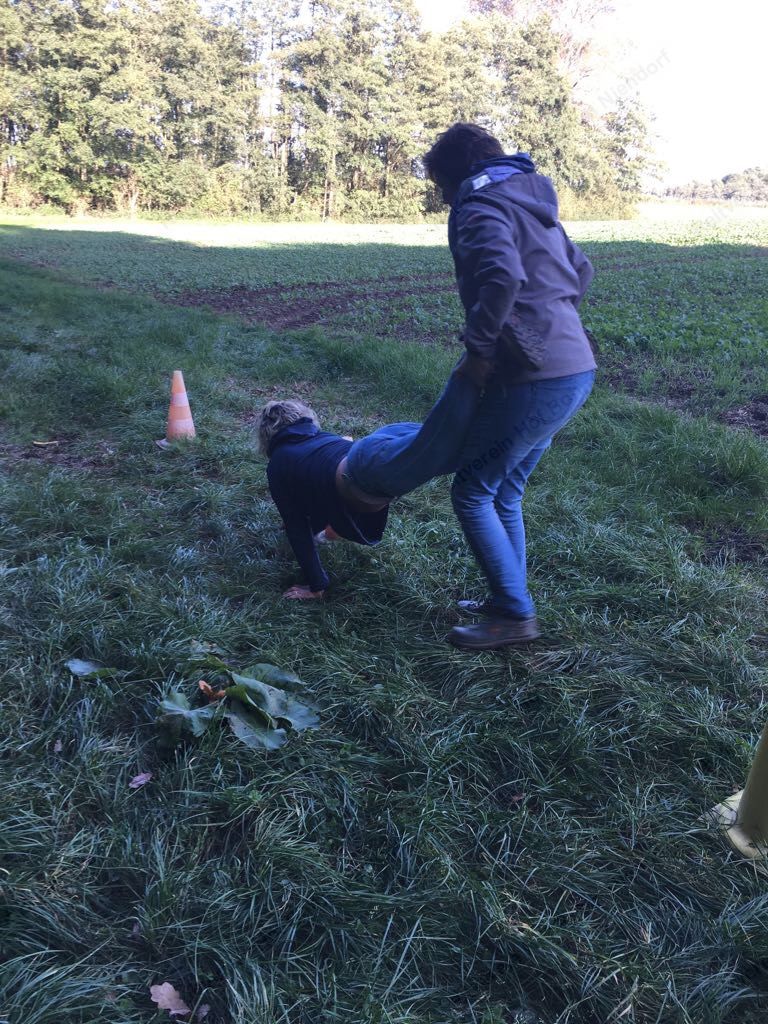 Mit einer menschlichen Schubkarre mußte hier ein rohes Ei durch einen Slalom gebracht werden.